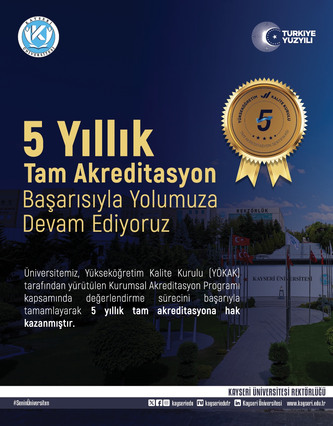Üniversitemiz, Yükseköğretim Kalite Kurulu (YÖKAK) tarafından yürütülen Kurumsal Akreditasyon Programı kapsamında değerlendirme sürecini başarıyla tamamlayarak 5 Yıllık tam akreditasyona hak kazanmıştır.