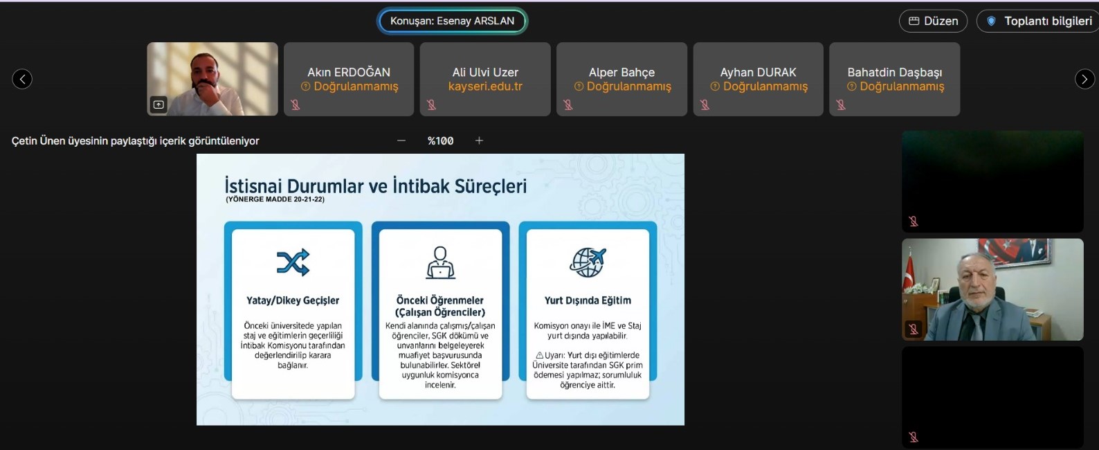Toplantının açılış konuşmasını yapan Rektör Yardımcısı Prof. Dr. Zeki TEKİN, üniversitemizdeki Eğitim-Öğretim kalitesinin sürdürülebilirliği için uygulama süreçlerinin önemine dikkat çekti. Ardından, Dr. Öğr. Üyesi Çetin Ünen tarafından gerçekleştirilen sunumda "Kayseri Üniversitesi Ön Lisans ve Lisans Uygulamalı Eğitimler Yönergesi" maddeleri detaylandırılarak, eğiticilerin uygulama aşamasında dikkat etmesi gereken kritik hususlar aktarıldı.