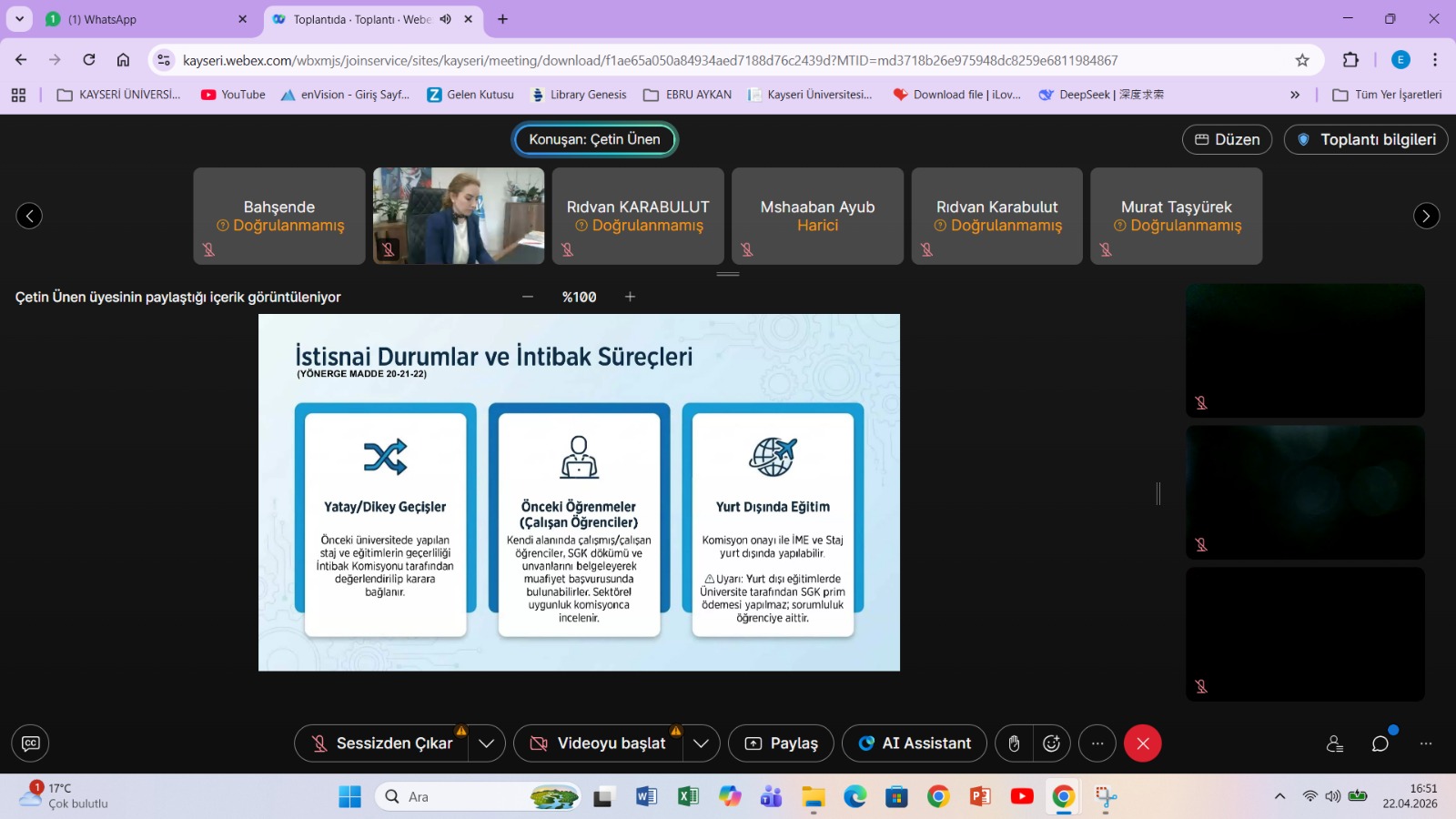 22 Nisan 2026 Çarşamba günü saat 16.00’da çevrim içi olarak gerçekleştirilen toplantı, Rektör Yardımcısı Prof. Dr. Zeki Tekin başkanlığında yapıldı. Akademik personelimizin yoğun katılım gösterdiği programda, uygulamalı eğitimlerin yeni dönem stratejileri ve yönerge detayları ele alındı.